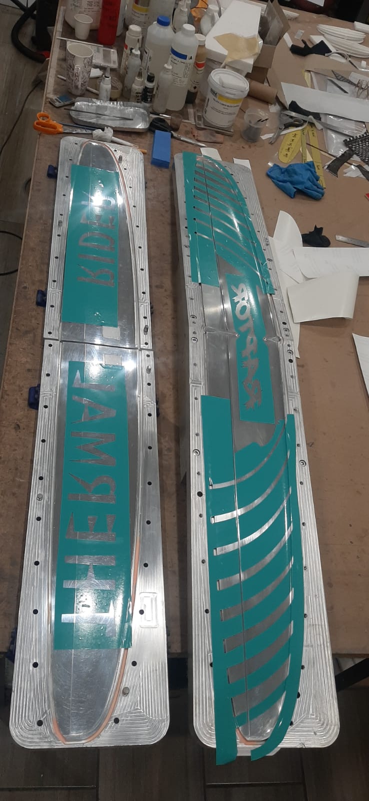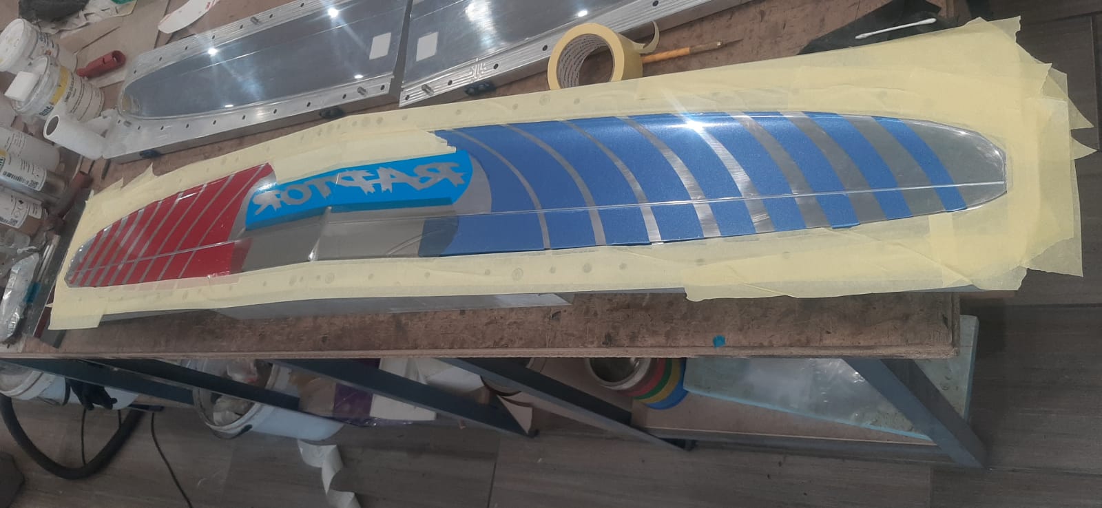 Getting this right takes real skill. The vinyl pieces must be cut precisely, laid without bubbles or misalignment, and the transitions between colours need to be sharp. Any imperfection here shows up permanently on the finished wing.