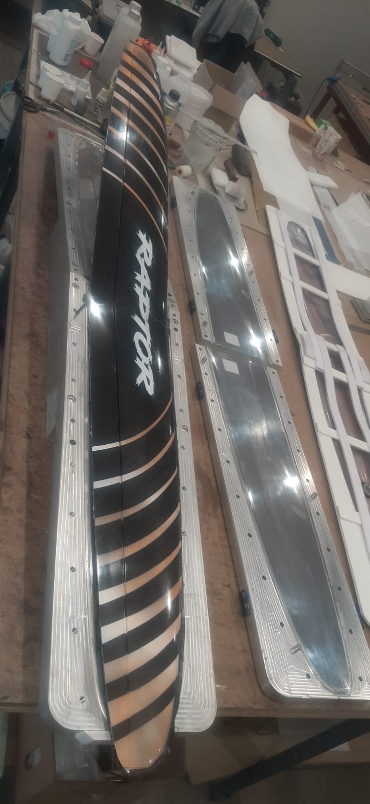 There’s a point in the build process where raw materials — rolls of carbon fibre, pots of resin, strips of coloured vinyl — transform into something that looks almost too good to fly. The Raptor DLG/F3K goes through exactly that journey, and these photos capture it beautifully.